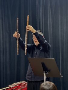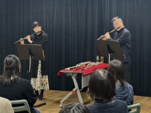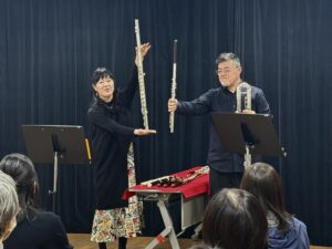 管楽器をテーマにした今回のおんまちラボ。第2回は『フルート編』と題して、バロックフルートから現代のコンサートフルートまで楽器の解説を交えながら聴き比べるミニコンサートを交えた講座になりました。参加された方は普段はなかなか見る(聴く)機会のない様々なフルートの音色に真剣に聴き入っていました。演奏してくださいましたフルート・デュオ“れこると”の塩谷信洋さん、横山聡子さん、どうもありがとうございました。