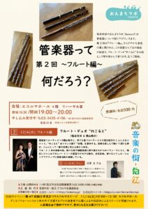 第2回は『フルート』編と題して、きらびやかな音色の裏に隠されたこの楽器ならではの独自の秘密を、フルート・デュオ“れこると”の塩谷信洋さん、横山聡子さんらをお迎えして解き明かして参ります。